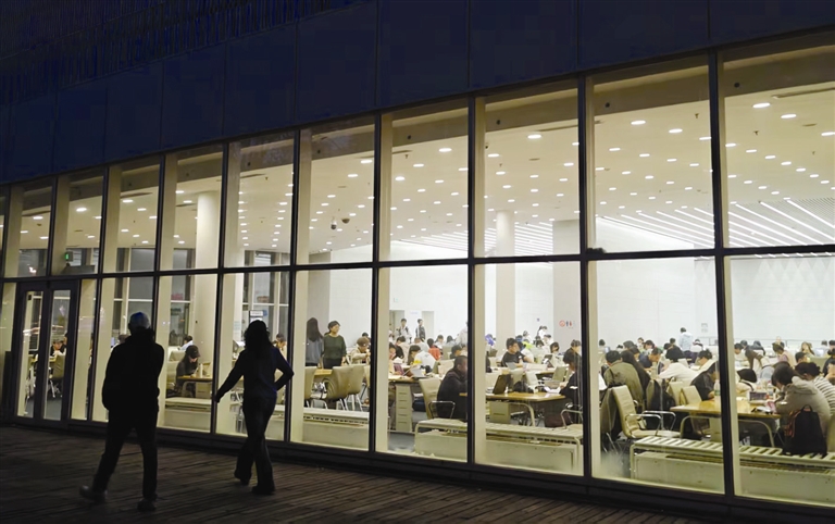 图书馆西侧的自习室内,巨大的落地玻璃窗映照着城市的夜景,也反射出室内一张张专注的面孔。炽白的灯光洒在宽大的书桌上,一眼望去,上百人同场自习的景象颇为壮观——有人捧着一本好书,徜徉于文字的世界;有人摆开教案默念,精心备课;有人则奋笔疾书,“决战题海”……