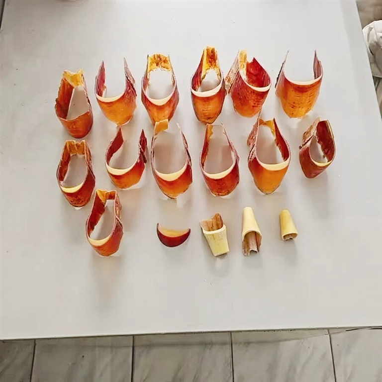 民警循线深挖、精准研判,快速锁定犯罪嫌疑人张某(化名)身份信息及落脚地,将其一举抓获,现场依法查获盔犀鸟头骨雕刻摆件等制品共计17件。