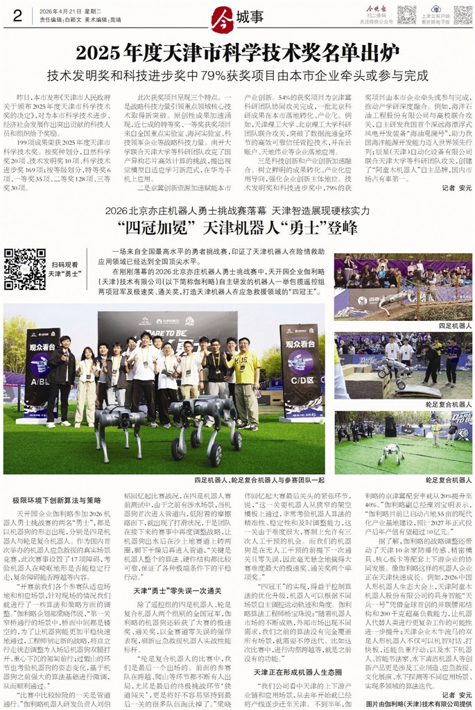 两条天津土著机器狗在北京战胜了来自全国其他地区的行业高手,在机器人险情救助这个赛道上一骑绝尘,夺得两个综合冠军和两个单项冠军。得知这个结果时,新闻人的直觉告诉我,要报道的不只是胜利的喜讯,更是近几年天津机器人一波波强悍战绩的再度升级,借此机会要让天津人了解咱们本土机器人的水平和江湖地位。