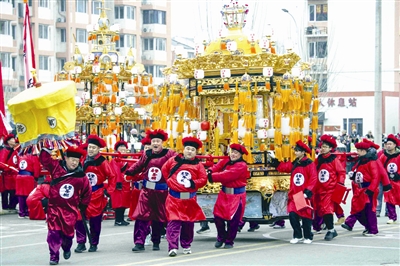 随着法鼓节奏渐起,各架辇亭依次登场,九架辇规制严谨、雕饰精美,五座亭匠心独运、意蕴悠长,昇平民乐韵律悠扬,完整呈现出九辇五亭的盛大阵列,尽显北方妈祖祭典的庄重与华美。格外引人注目的是,青春洋溢的葛沽少年们抬着六架小辇精神抖擞、步伐稳健,以昂扬姿态扛起文化传承之责,成为巡游队伍中一道亮眼的风景。