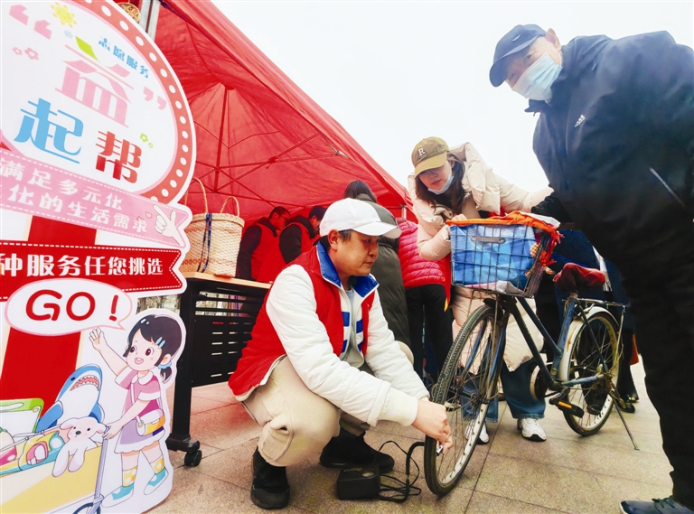 本次活动还在集贤公园设立分会场,举办特色公益市集活动,由各社区及共建单位共同参与,现场设置文创义卖、民俗小吃、便民志愿服务、政策宣传等多个特色摊位。志愿者为居民提供自行车维修服务,细心调试检修,切实解决群众出行小难题;同时耐心指导老年居民使用智能手机,帮助老年人跨越数字鸿沟,享受智能生活便利。天津市胸科医院医护志愿者服务队的男护士志愿者们也来到现场,作为男护士志愿服务小组为居民提供健康咨询与专业护理指导,用专业服务守护群众身体健康。大家在互动体验中传递温暖、服务群众,营造共建共治共享的浓厚氛围。