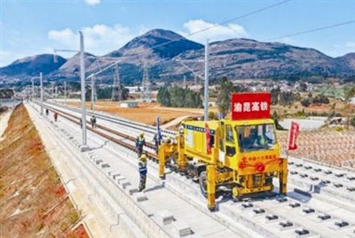 近日,在位于云南省昆明市嵩明县的渝昆高铁施工现场,随着第一对500米长钢轨稳稳落在无砟轨道上,渝昆高铁云南段正式开始铺轨。