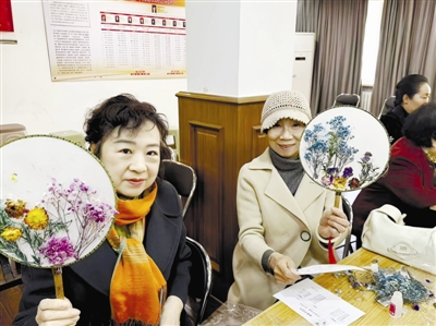3月24日上午,河北区华屏里社区活动室里,近三十位老奶奶围坐一堂,或手持精致团扇,或细心粘贴干花——这是一场专为她们举办的“巧手制扇”活动。