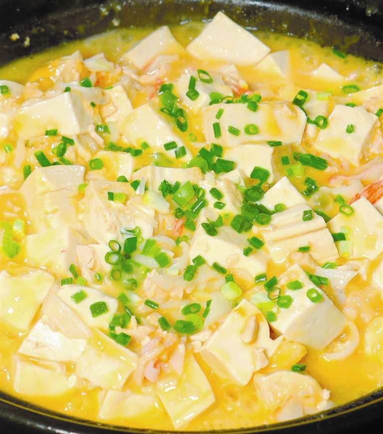 小贴士:蟹黄豆腐煲原本使用蟹黄制成,后因蟹黄成本高、取制复杂,常用咸鸭蛋黄代替。