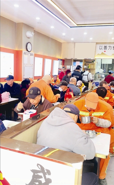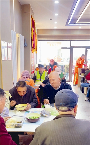 来就餐的有头发花白的老人、身着橙色工装的环卫工人,也有带着孩子来的中年人。“婷婷,今天打卤面这卤子真香!”“婷婷,辛苦你们啦!”……被唤作“婷婷”的女孩是齐珍斋免费餐厅的店长。她一边麻利地收拾着桌上的空碗,一边回应着老人们的寒暄。