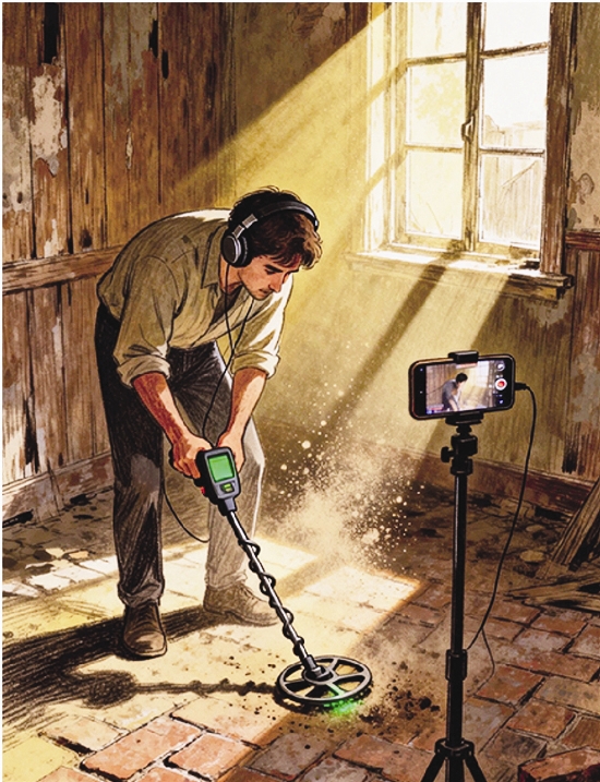 久无人居的“地主老宅”里,主播手持金属探测器“寻宝”,伴随着探测仪“嘀嘀嘀”的提示声,一个沾满泥土的瓷罐被挖出,罐内装有数枚“古钱币”。主播一边操作一边与“粉丝”互动:“家人们,我寻宝这么多年都没见过这么好的品相。”