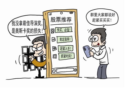 据媒体近日报道,吉林长春的王先生被诱导加入某“内部荐股”直播群,群里热火朝天,人人晒盈利截图。正当他准备加大投入交付黄金时,警方上门对其进行了紧急拦截。原来,6000多人的群里九成成员是“演员”或是非真人的虚假账号,软件也是伪造的,连“券商客服”工号都是假的,群内抢购股票的行为均是精心编排的“剧目”。漫画 张驰作