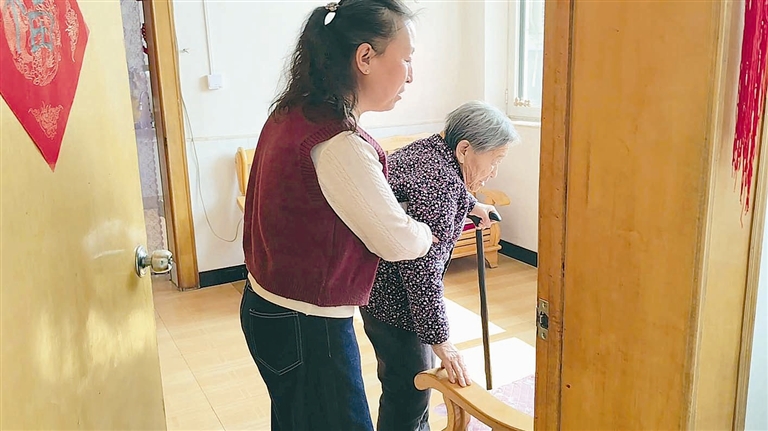 初春的午后,阳光和煦。记者来到田家务村一处宁静的小院里,52岁的黄金花正陪着84岁的养母冯秀晒太阳。她坐在母亲身旁的小凳上,一手轻揽着老人的肩,另一只手拿着木梳,动作轻柔地为养母梳理着花白的头发。